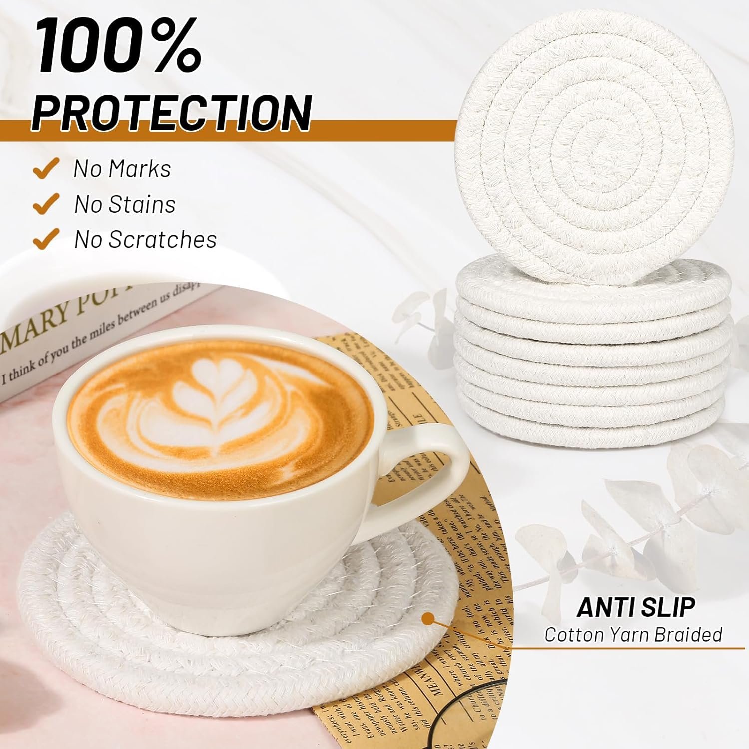 • The coasters are anti-slip, super absorbent, and safe for all types of tabletops—wood, glass, marble, and more.