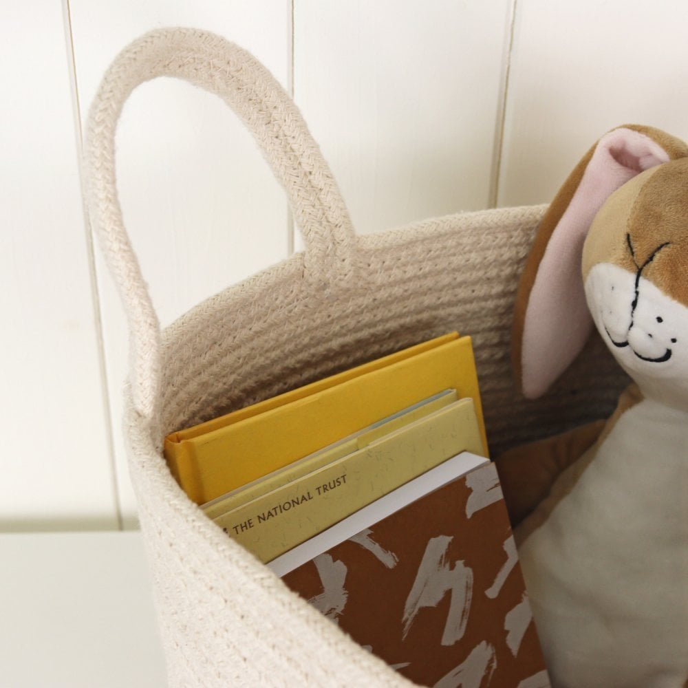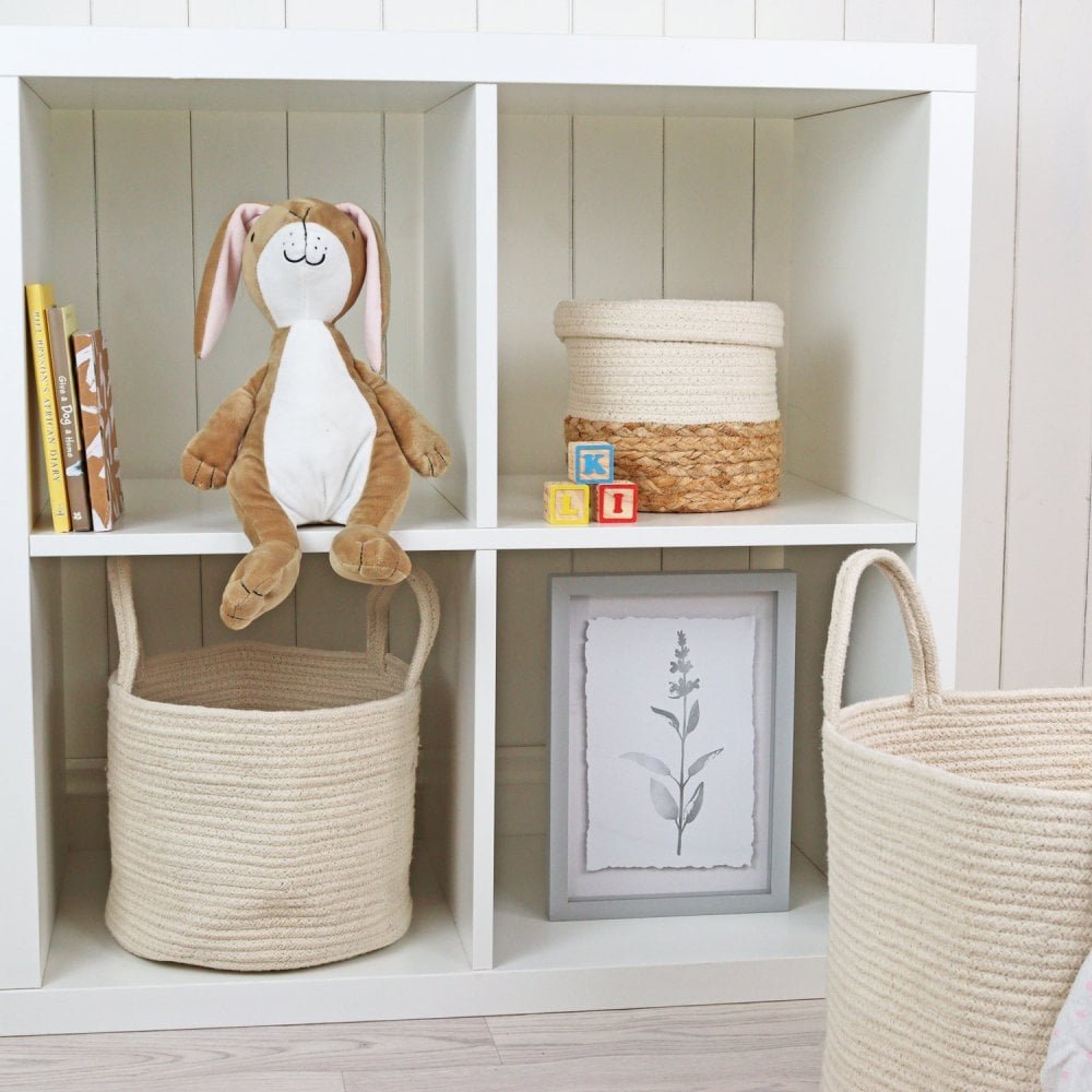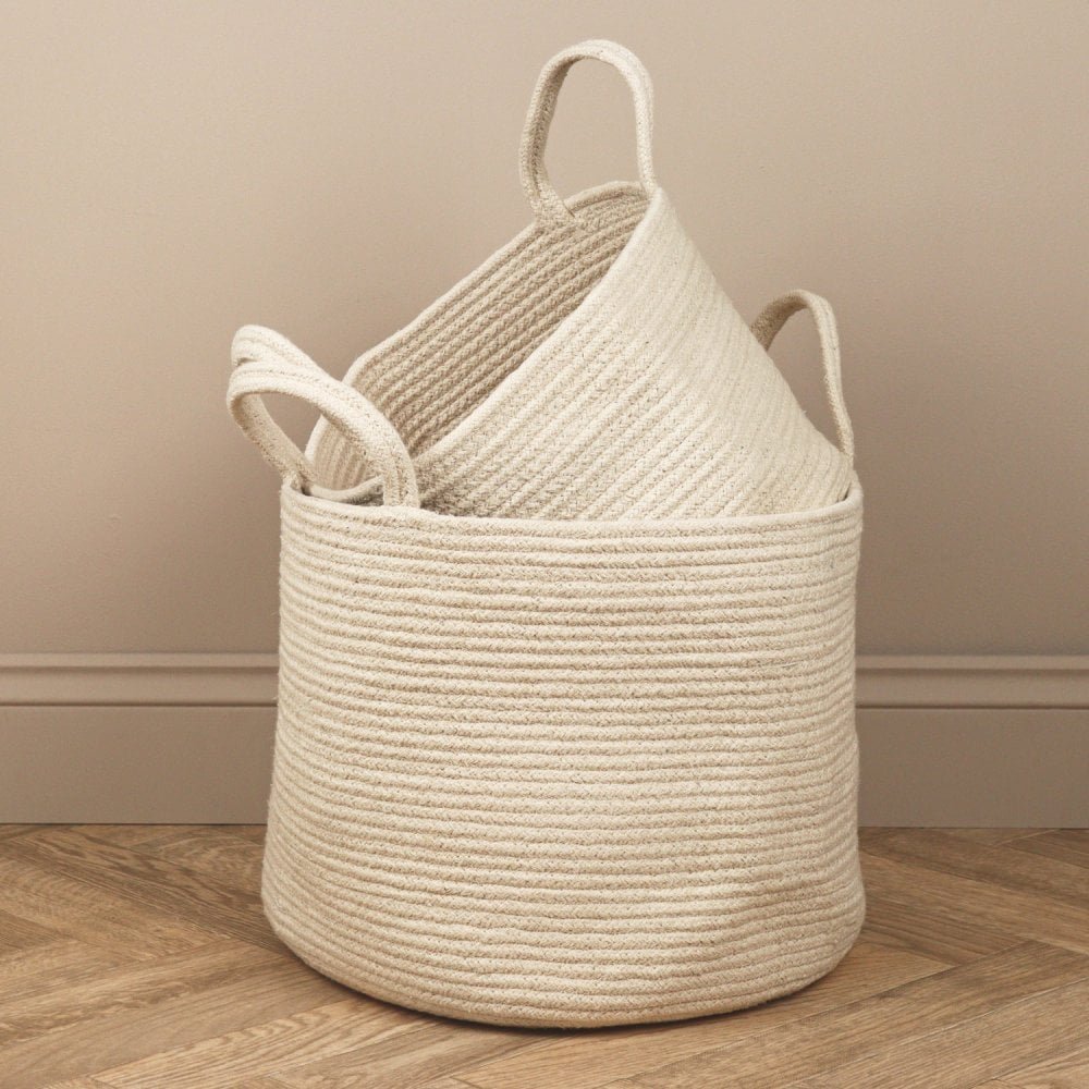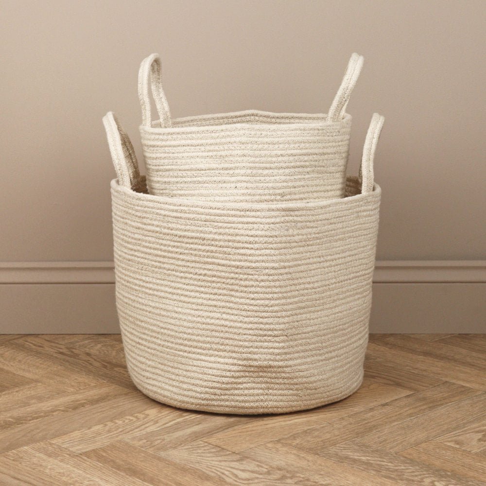 Their soft cream color and minimalist design make them a perfect fit for modern, boho, or rustic interiors. Equipped with sturdy handles, these baskets are easy to carry, whether you’re organizing laundry, toys, blankets, or other household items.