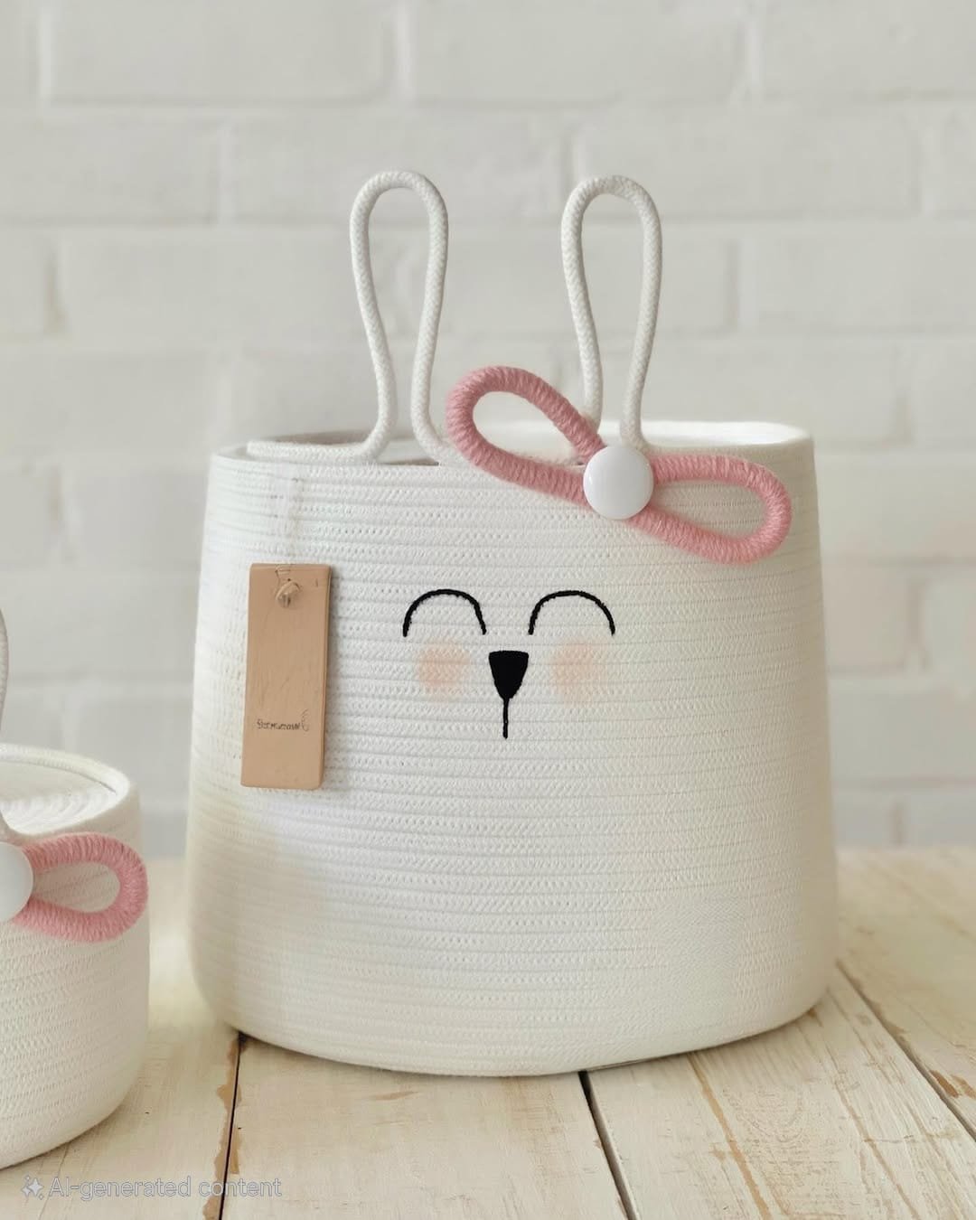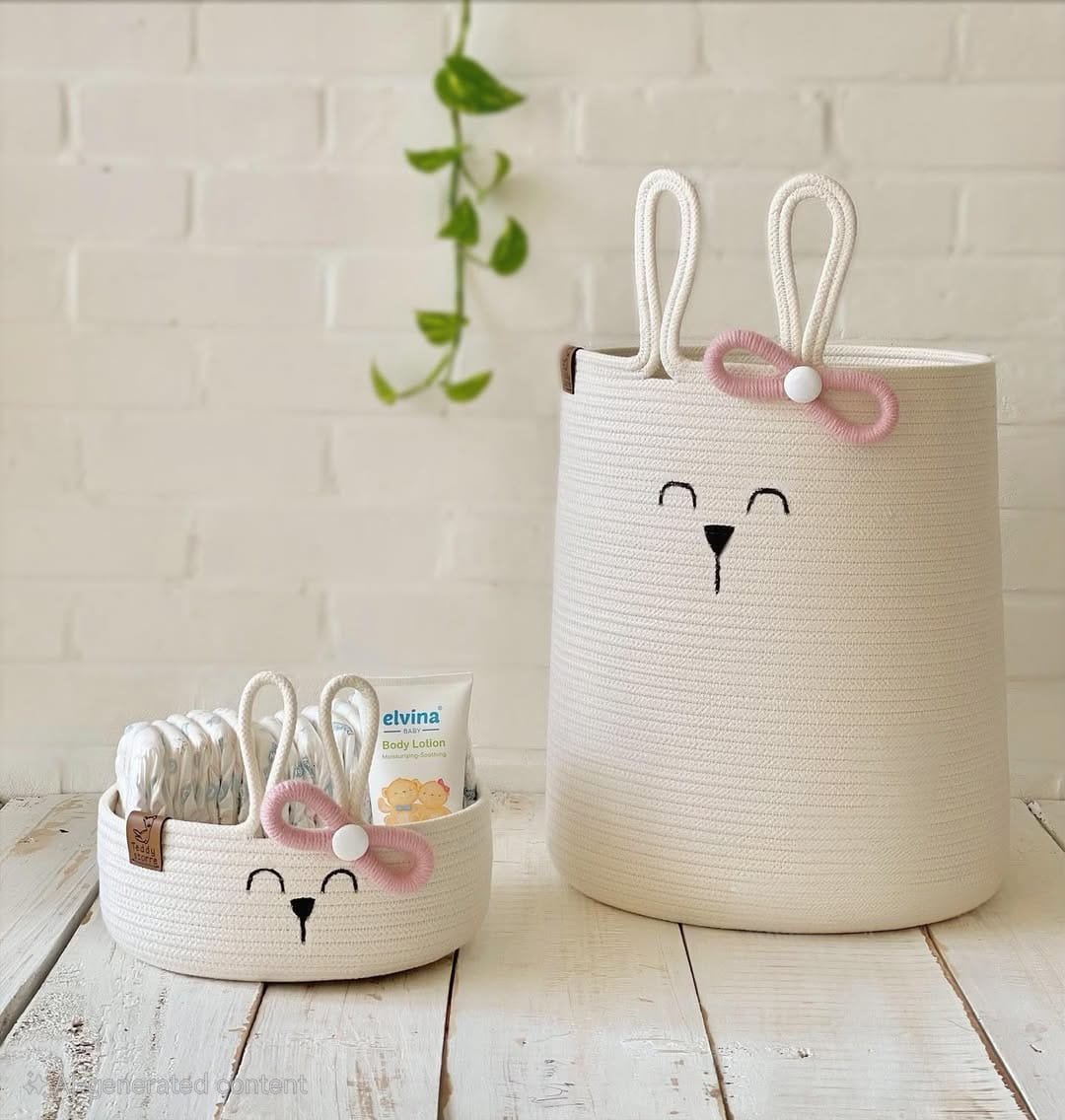 Bring joy and charm to your nursery or kids’ room with our Cute Bunny Face Cotton Rope Basket, designed with soft, durable cotton rope and an irresistibly cute bunny face. Featuring bunny ears and a pink bow, these baskets are ideal for storing toys, diapers, clothes, baby essentials, or even decorative items.