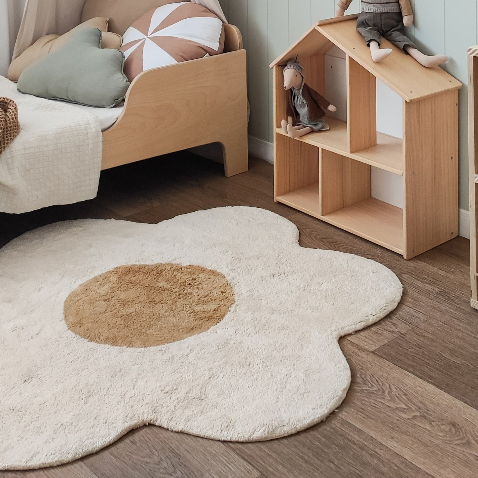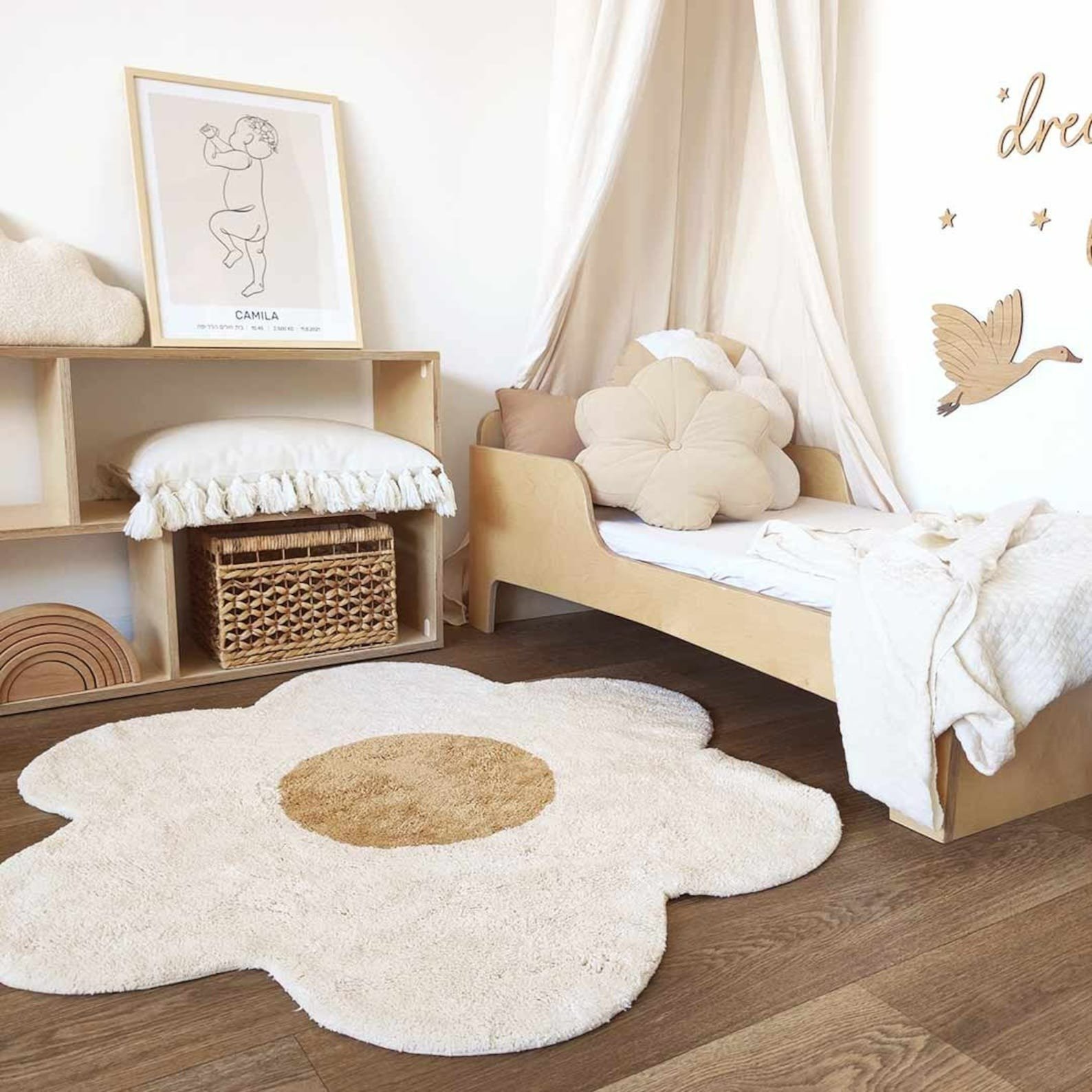 Transform your child’s room into a cozy and aesthetic space with this Handmade Flower Tufted Rug. The soft cream petals and warm beige center make it a perfect choice for a kids’ room, nursery, reading corner, or play area. Its calming colors blend beautifully with Scandinavian and minimalist room décor.