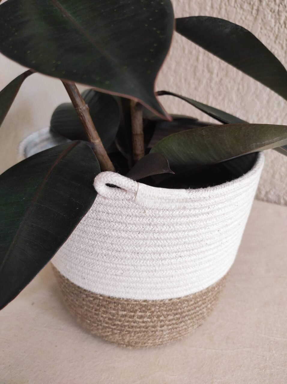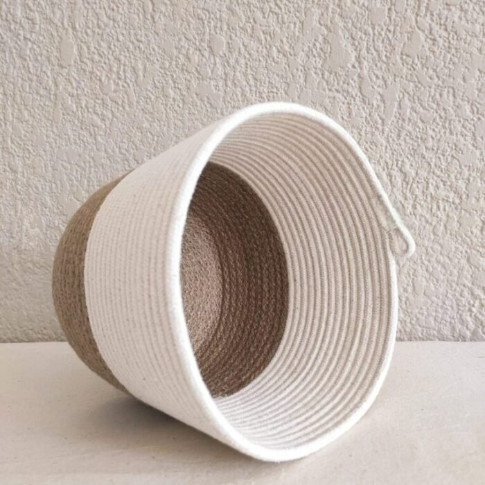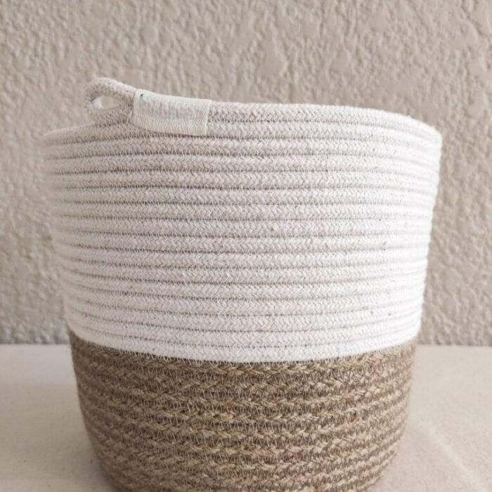 Add functionality and beauty to your home with this handcrafted Jute and Cotton Basket. Designed with a natural blend of jute and cotton cord, this versatile basket offers a perfect solution for organizing your essentials or enhancing your home decor. Its two-tone design adds a rustic yet modern charm to any room, while the durable materials ensure long-lasting use. Use it for storing household items, as a decorative planter cover, or simply as a statement piece for your home.