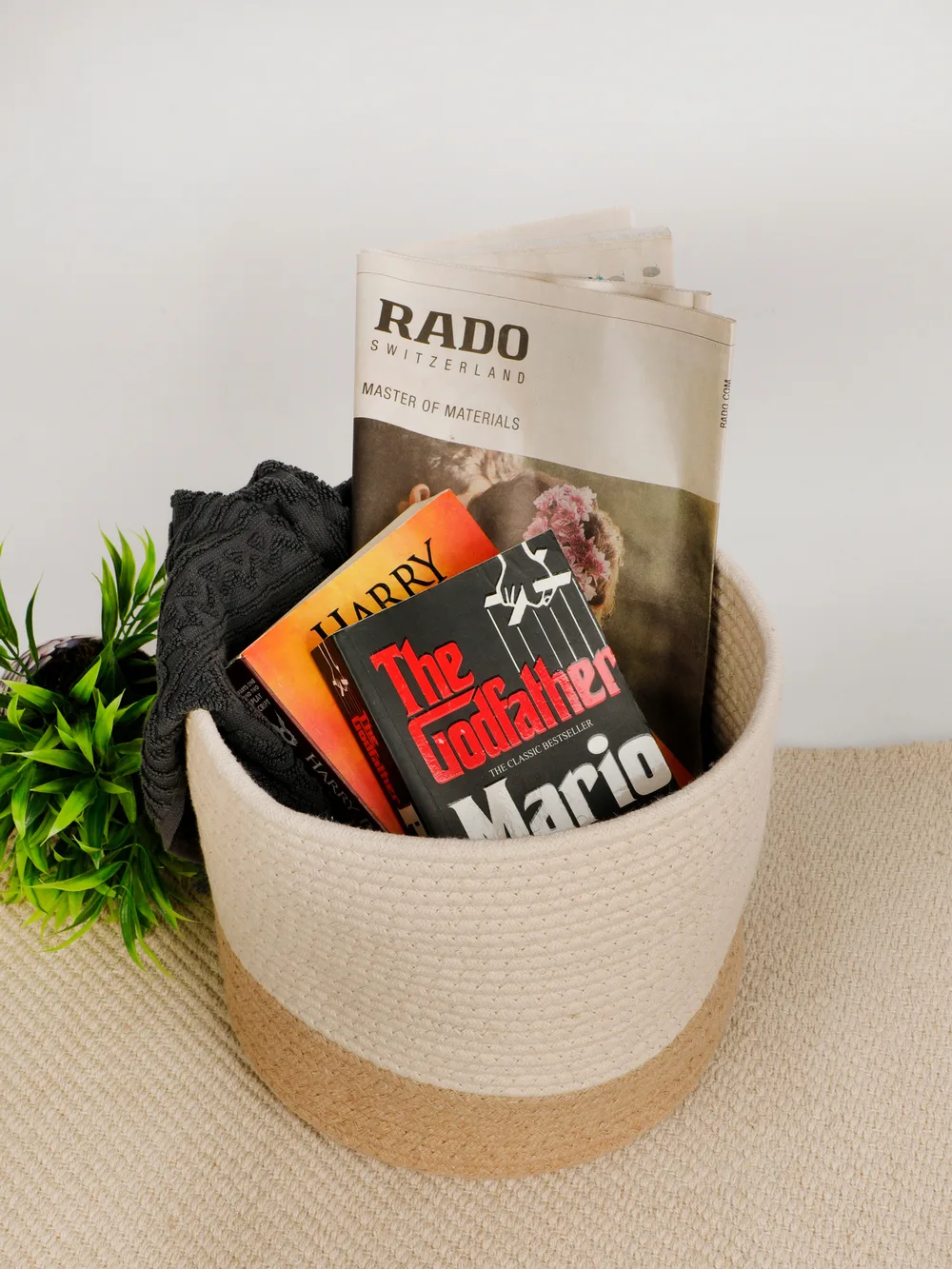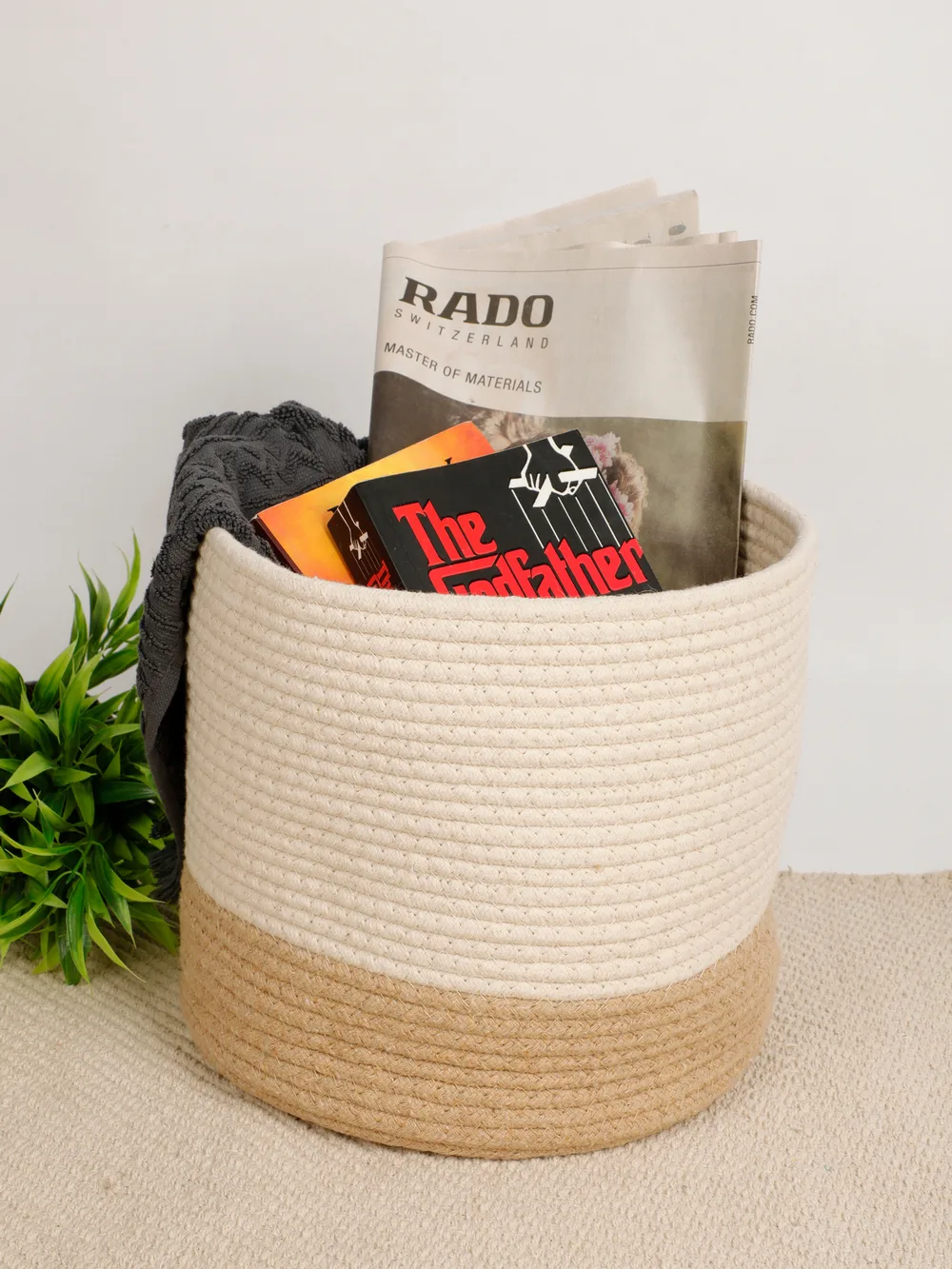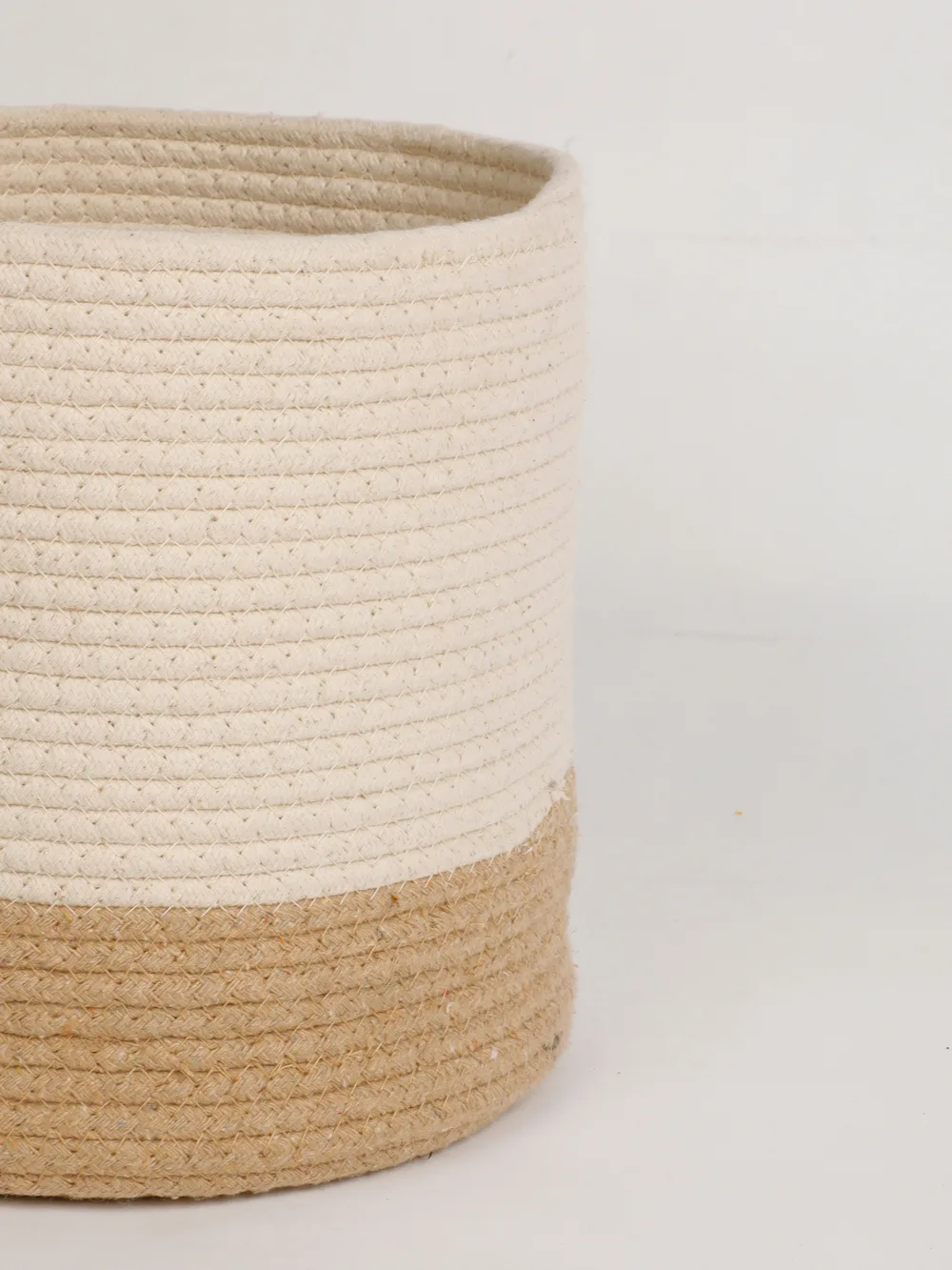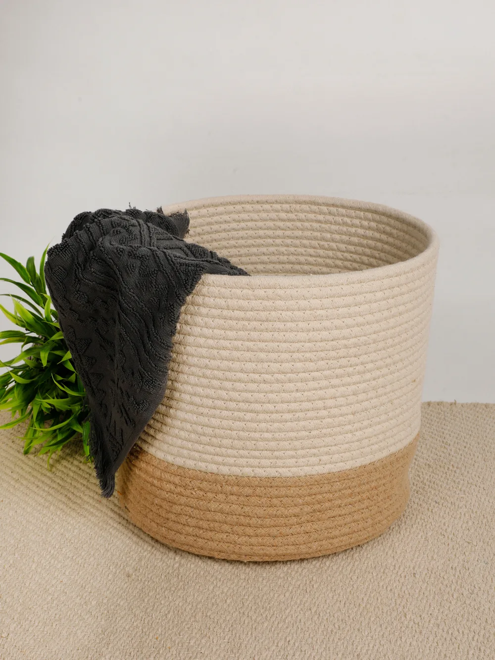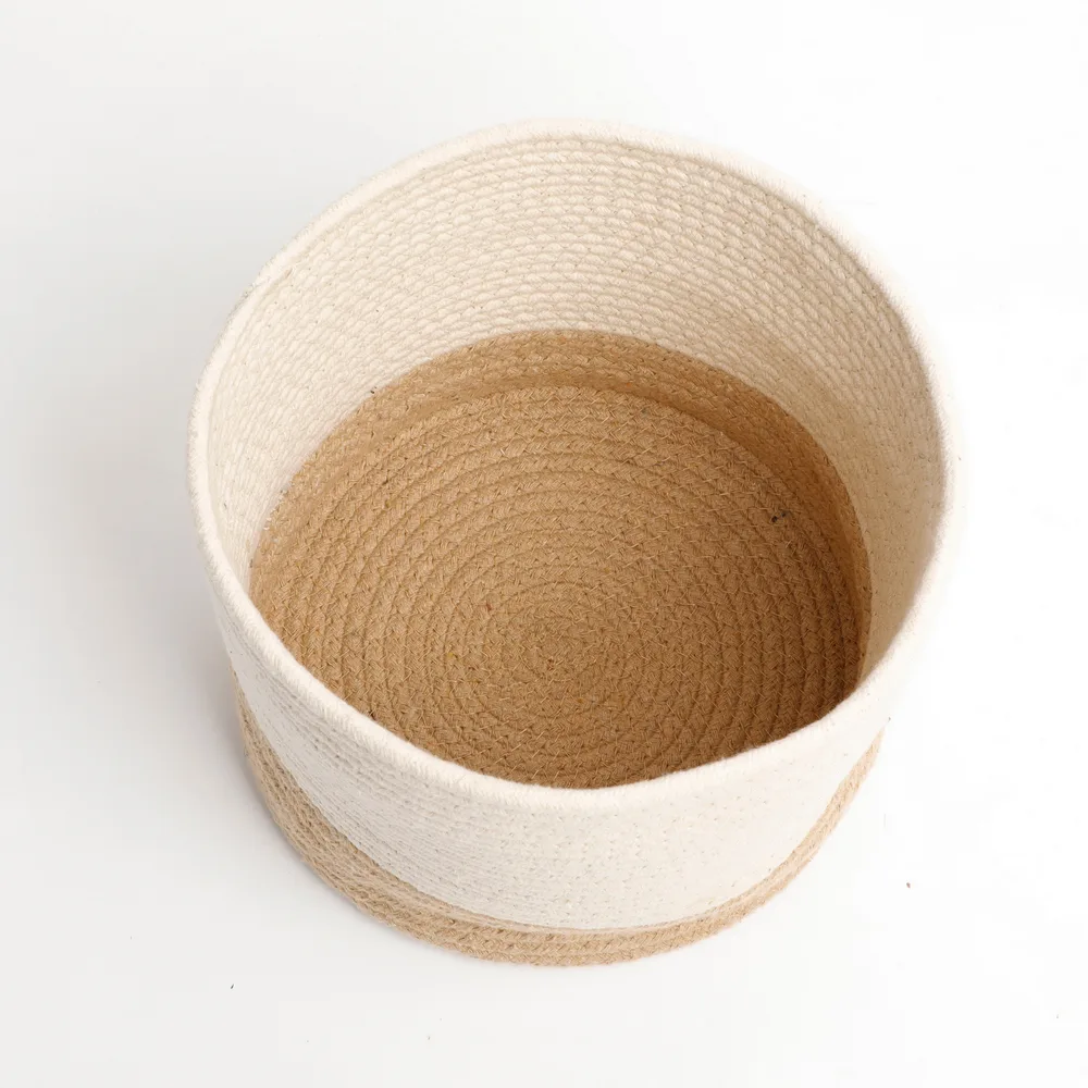 Made from a blend of natural jute and soft cotton rope, this basket features a neutral two-tone design that seamlessly fits into any decor style, whether modern, rustic, or minimalist. Lightweight and durable, it is a perfect addition to living rooms, bedrooms, offices, or bathrooms.