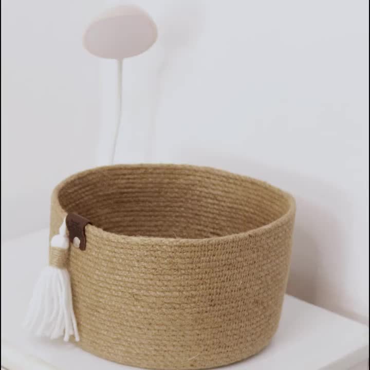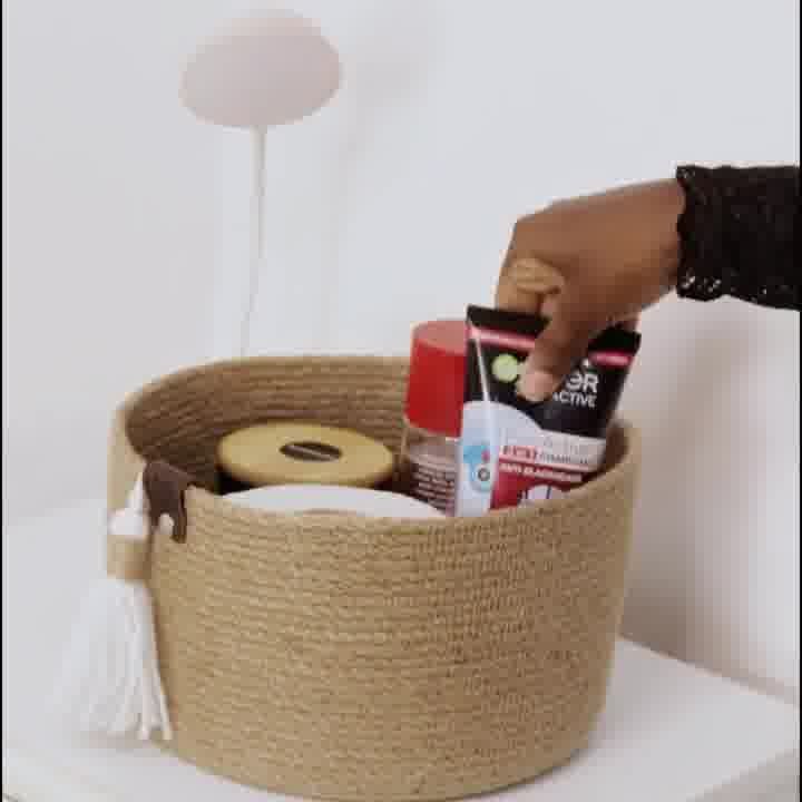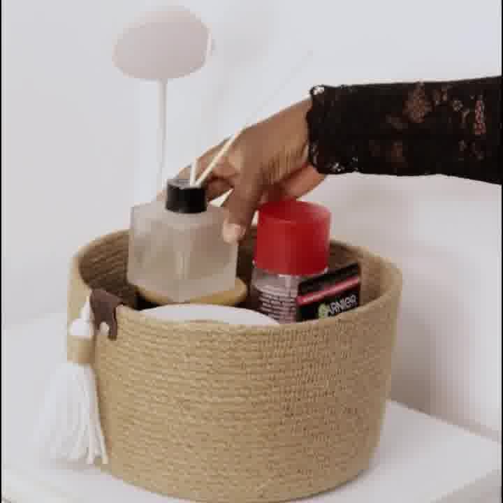 Its compact size and lightweight construction make it perfect for use on countertops, dressers, or shelves, while the added tassel detail adds a touch of elegance. The basket’s neutral tone ensures it blends seamlessly into any decor style, from rustic to modern. Whether you’re looking to declutter your bathroom, bedroom, or living room, this versatile jute basket is a stylish and functional solution.