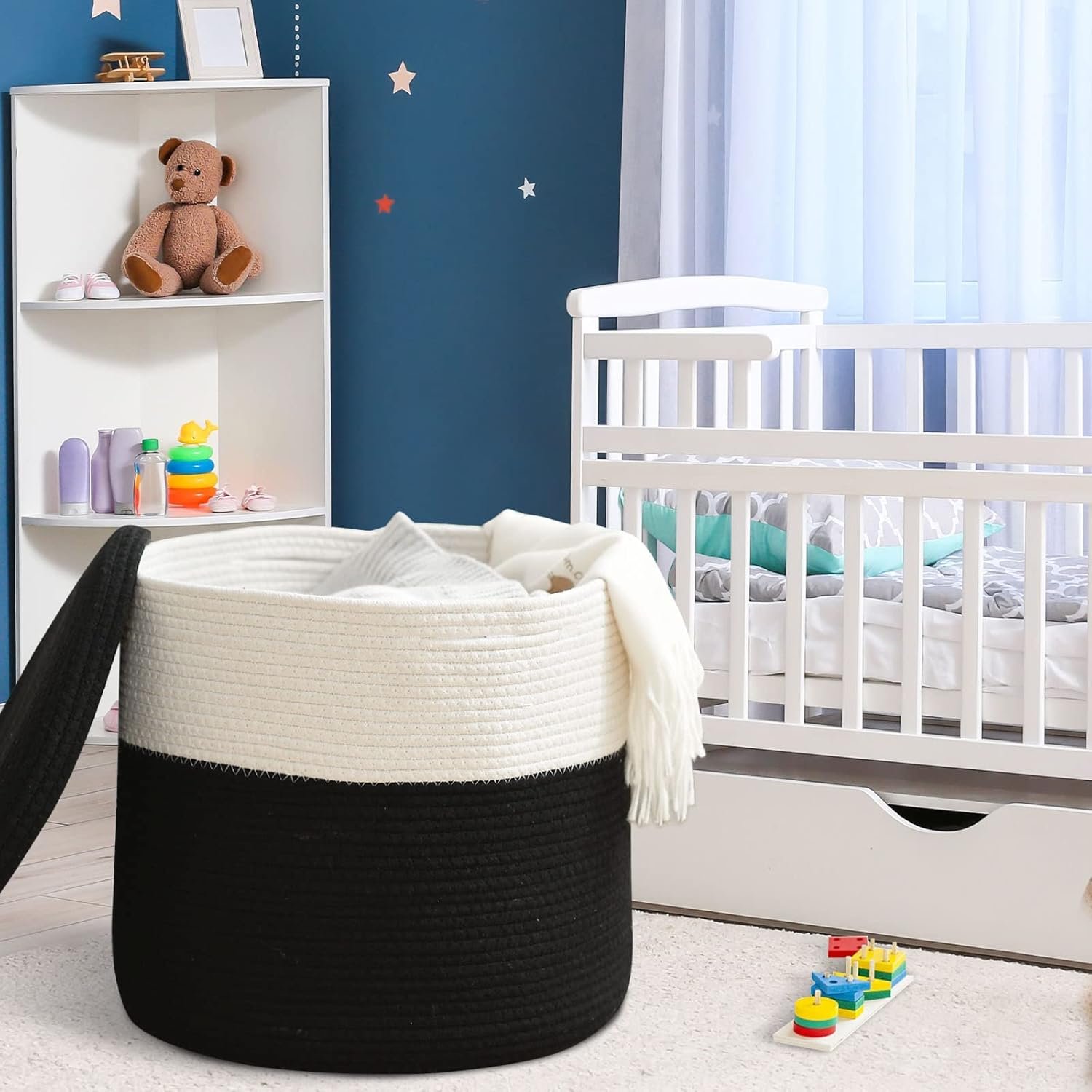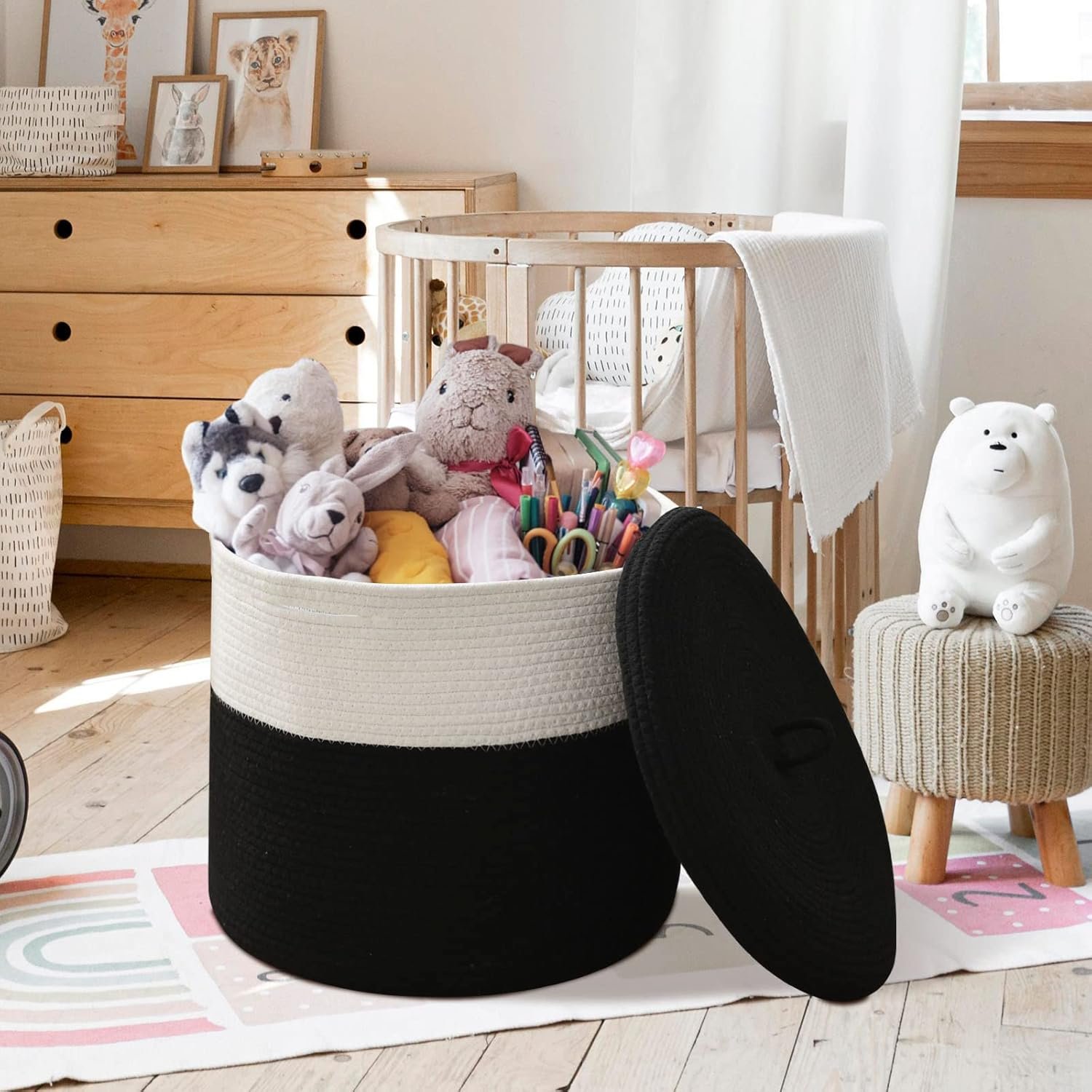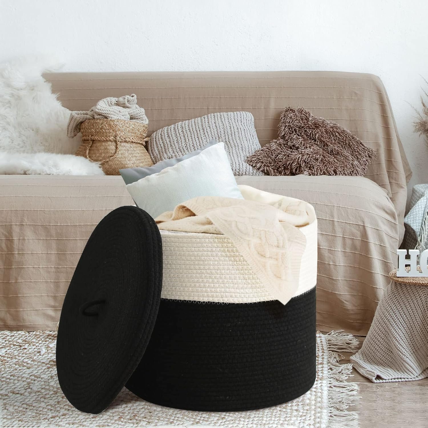 Crafted from 100% natural cotton rope, this basket is eco-friendly, soft yet sturdy, and safe for families with kids or pets. The secure lid keeps your items dust-free and out of sight, making it ideal for the bedroom, nursery, laundry area, or bathroom. With reinforced hidden handles, it’s easy to carry around.
