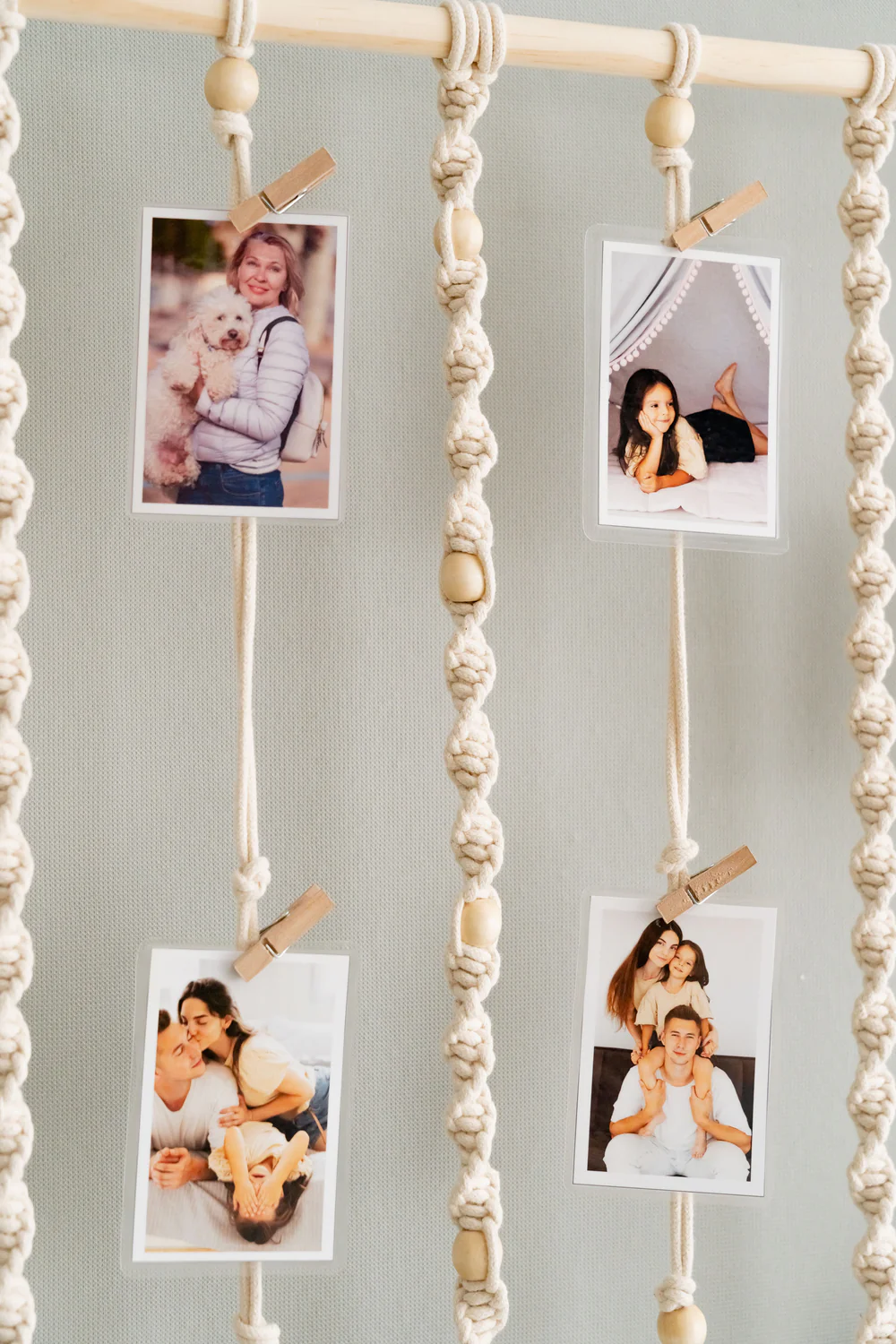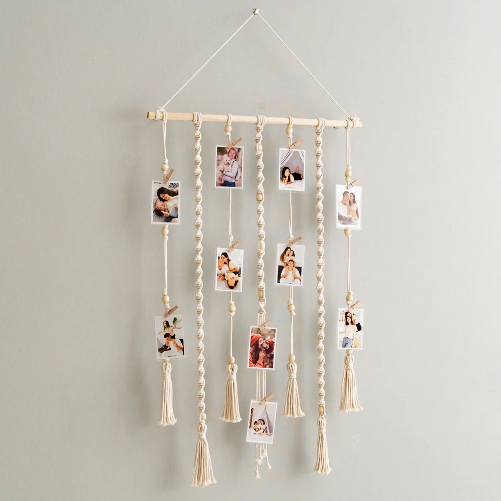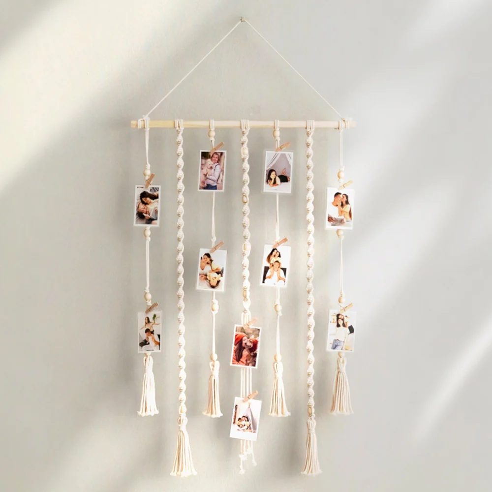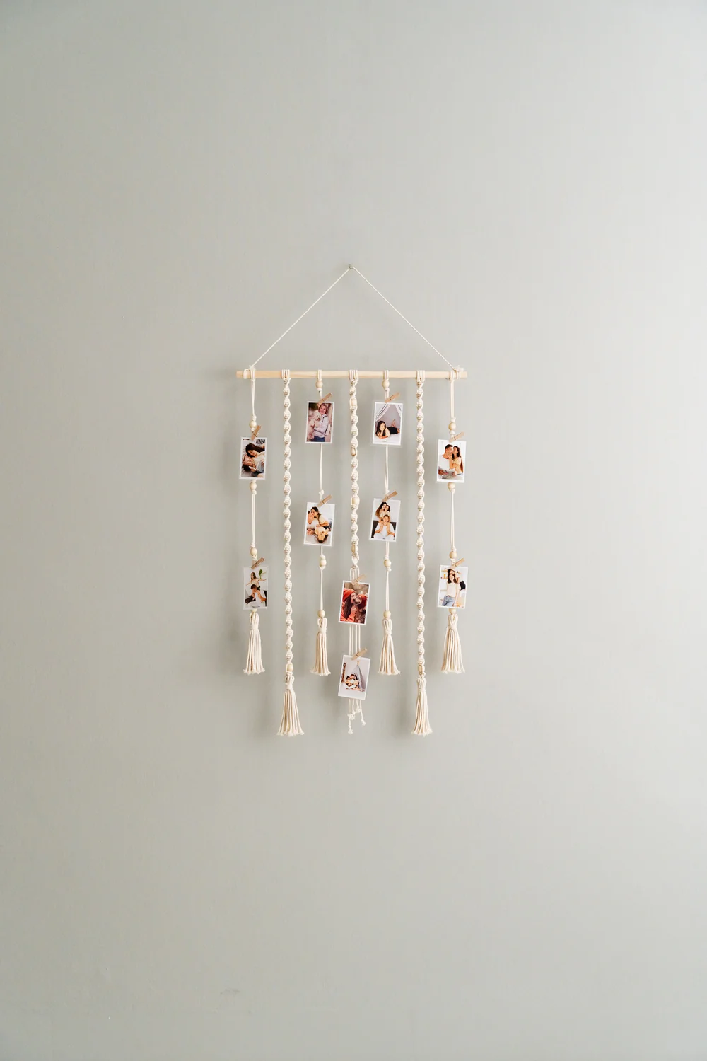 The macrame strings are secured to a wooden dowel and hung with a cotton loop, making it lightweight, easy to install, and gentle on your walls. It’s not just décor—it’s a memory keeper that personalizes your space with moments that matter.