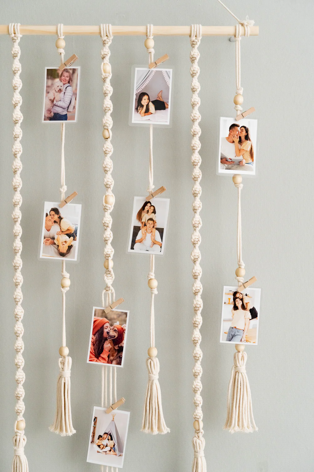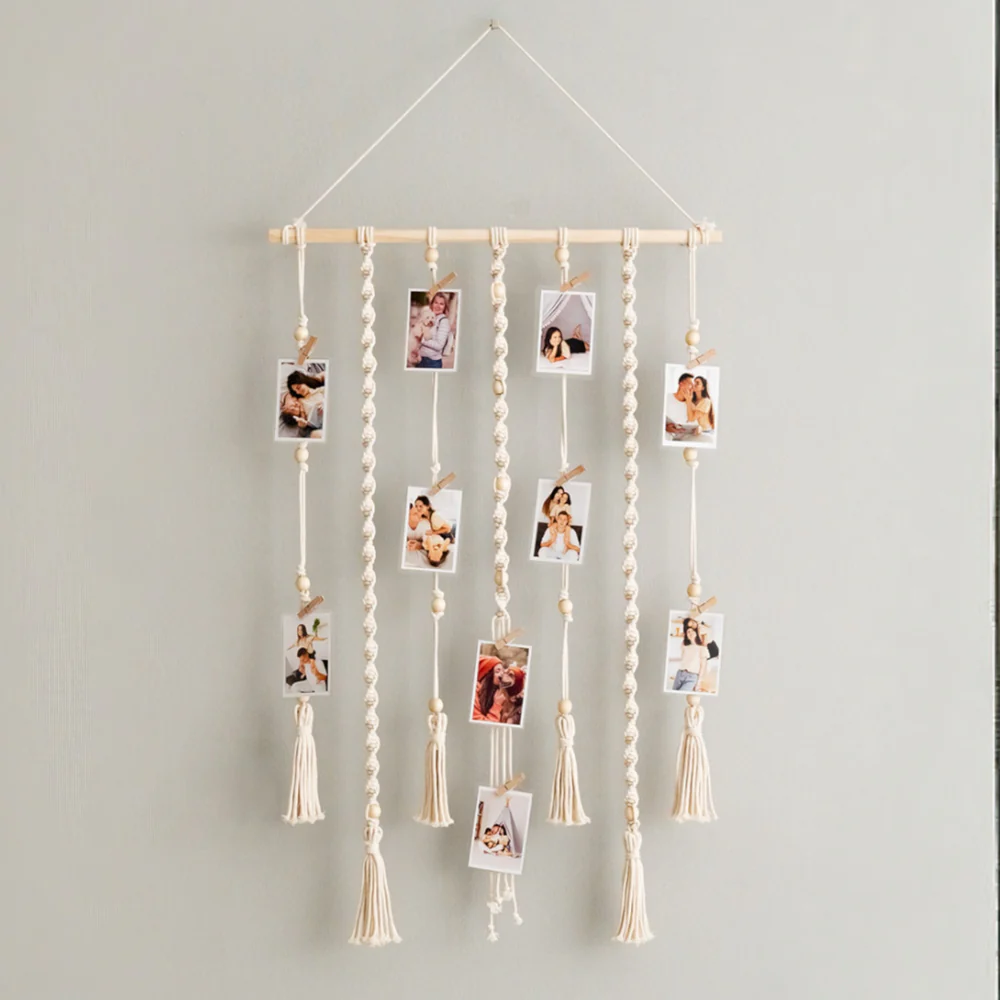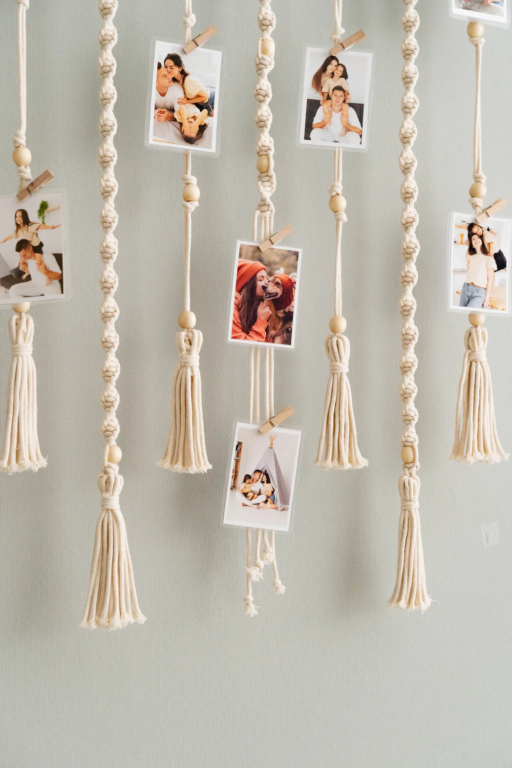 The macrame strings are secured to a wooden dowel and hung with a cotton loop, making it lightweight, easy to install, and gentle on your walls. It’s not just décor—it’s a memory keeper that personalizes your space with moments that matter.