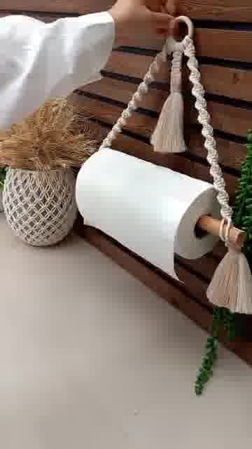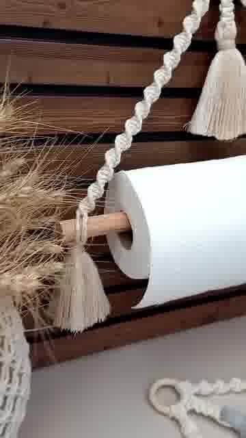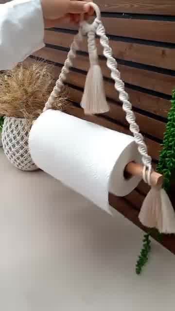This handmade macrame paper towel holder combines boho elegance with functionality, making it a stylish and practical storage solution for any kitchen or bathroom. Crafted from 100% natural cotton rope and featuring a sturdy wooden dowel, this hanging tissue holder is designed to hold both paper towel rolls and toilet paper rolls effortlessly.
