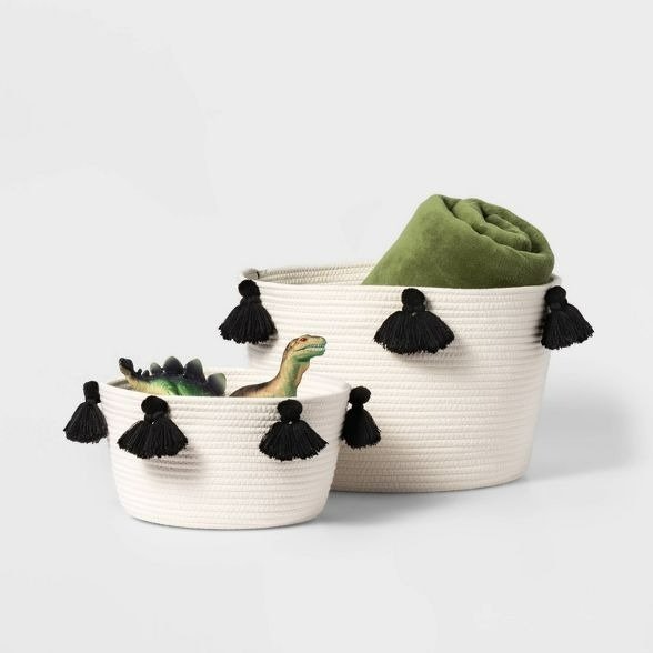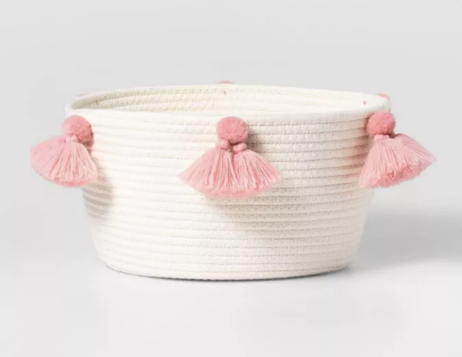 Bring style and organization to your home with this round cotton rope basket adorned with pink tassels. Handcrafted from 100% eco-friendly cotton rope, this durable and lightweight basket is both functional and decorative. Its soft pink tassels add a whimsical charm, making it an excellent addition to nurseries, kids’ rooms, or any space in need of a playful yet elegant accent.