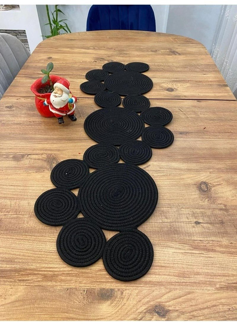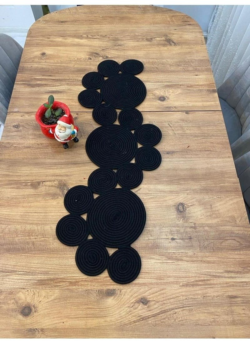Add bold elegance to your dining table with this handcrafted black cotton rope table runner. Measuring approx. 14 inches x 39 inches, this artistic table runner features a unique circular patchwork pattern, perfect for both everyday decor and festive gatherings. Whether it’s a modern home, rustic space, or boho-style setup – this versatile black runner adds style and texture effortlessly.