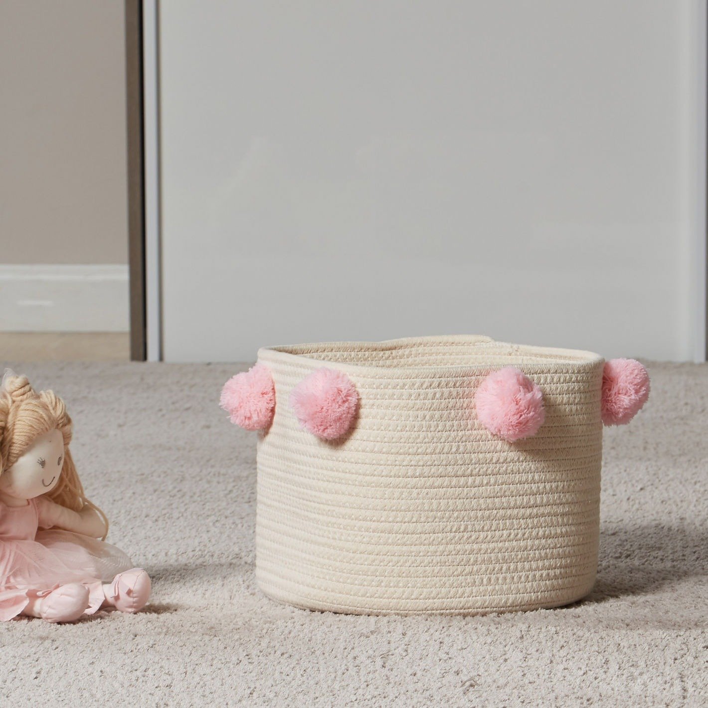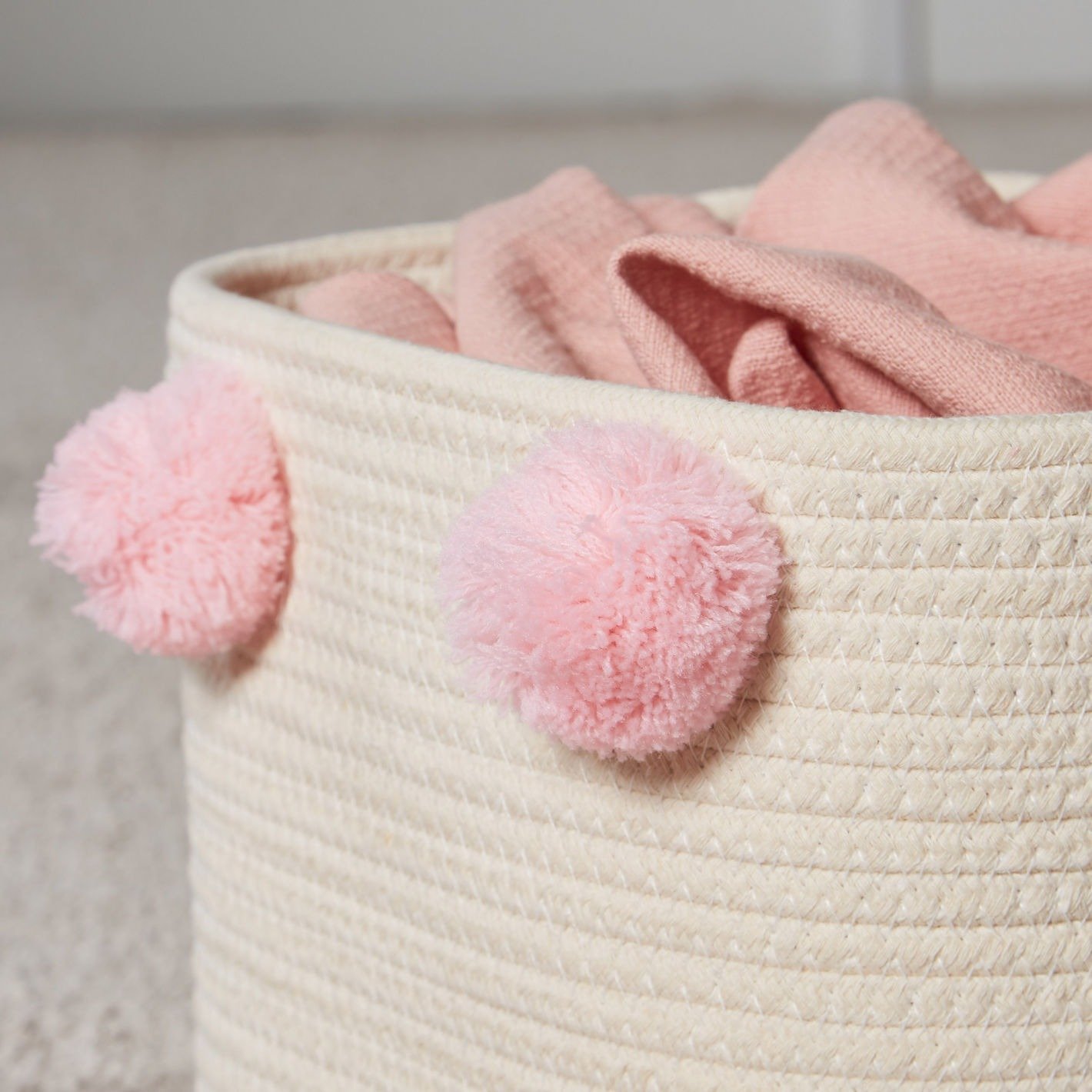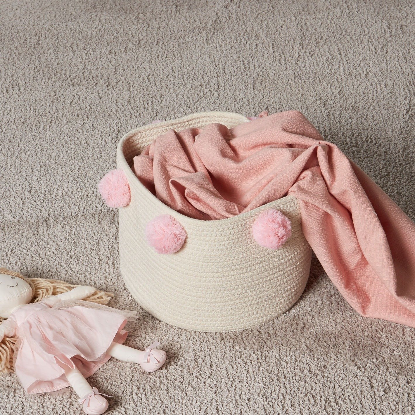 Expertly handcrafted with durable and eco-friendly cotton rope, the basket is soft yet sturdy – safe for kids and gentle on floors. The eye-catching pompom design adds a fun, whimsical touch that little ones adore, making it an ideal storage solution for nurseries, playrooms, or baby shower gifts.