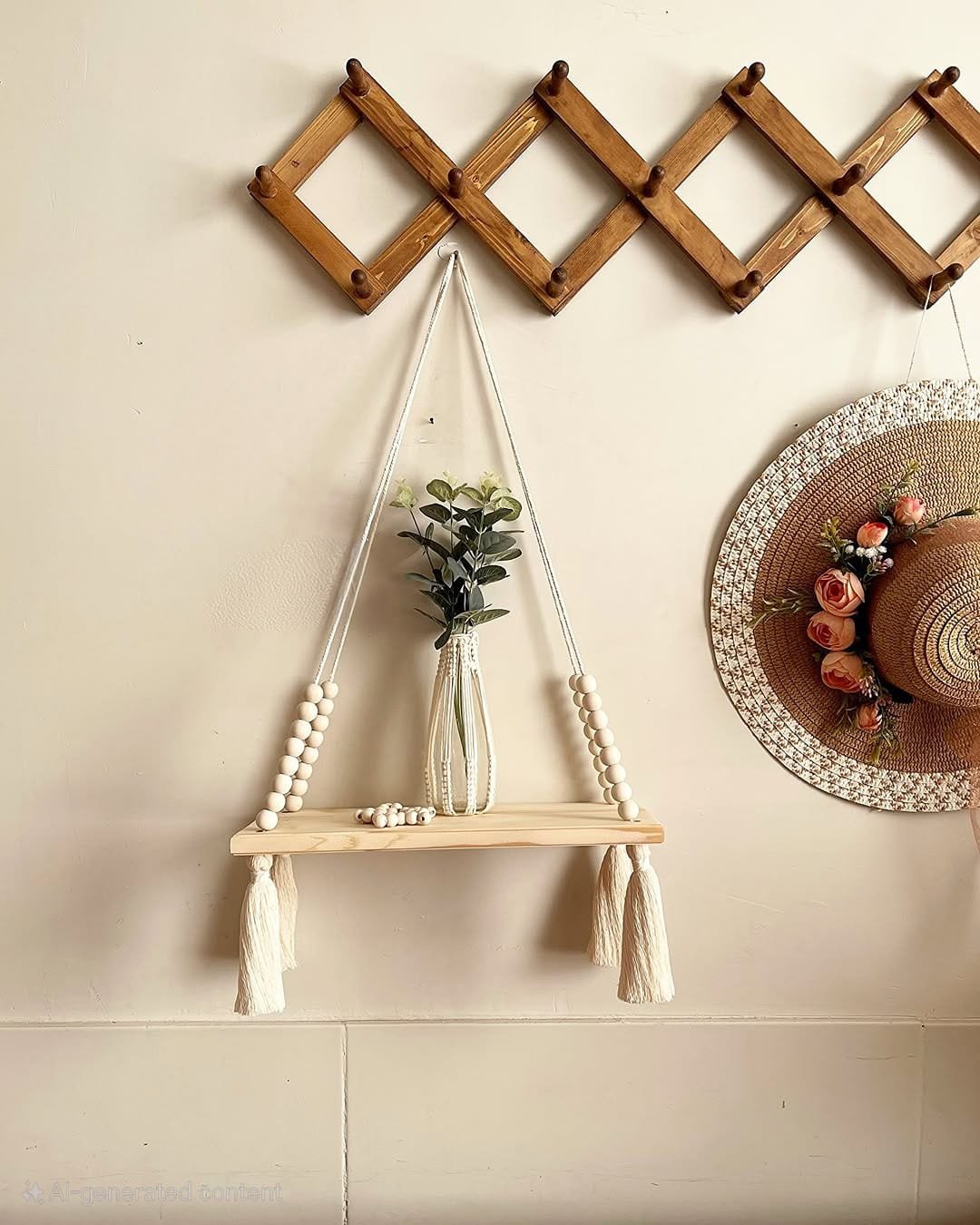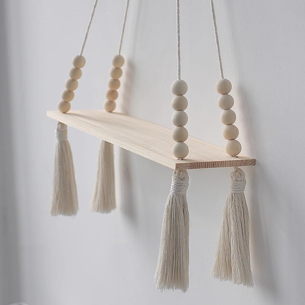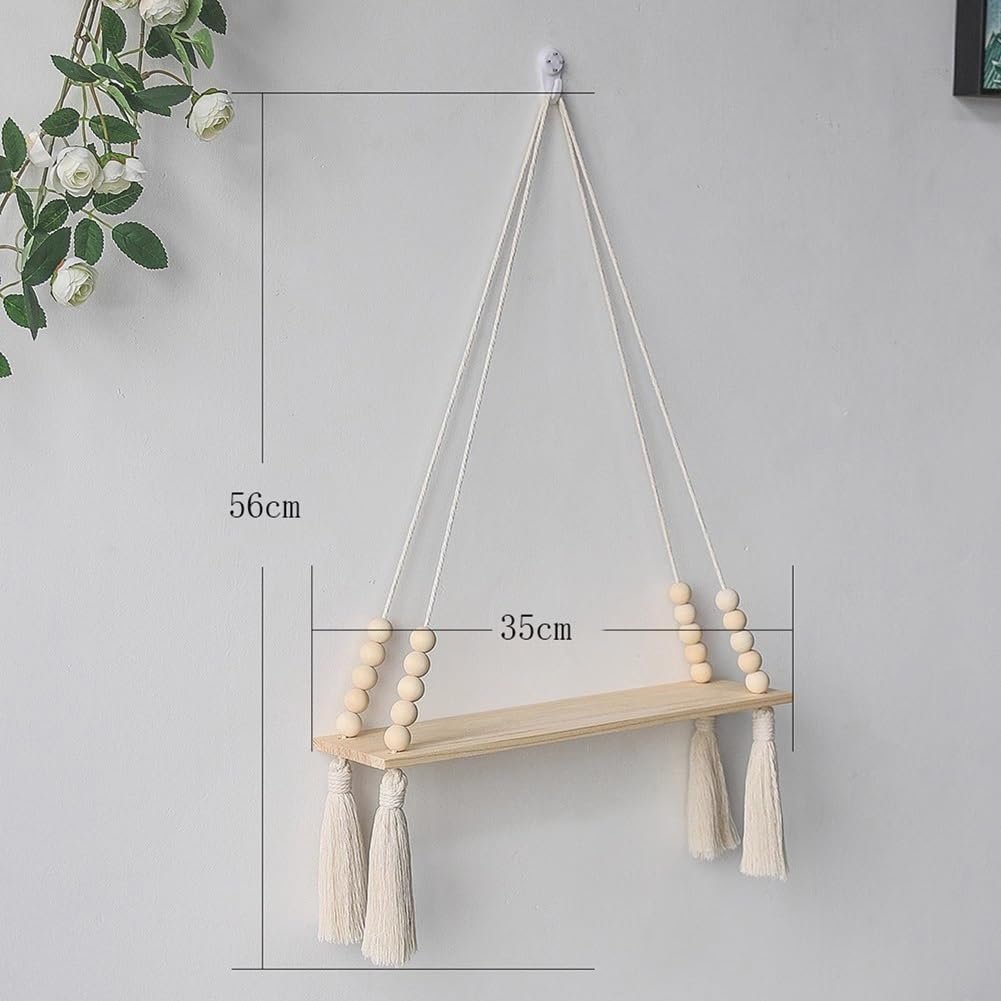 Measuring approximately 56cm in total height, this shelf is compact yet functional – perfect for small spaces where you want to showcase decorative accents without clutter. Whether it’s your bedroom, bathroom, nursery, or entryway, this hanging shelf effortlessly blends with bohemian, Scandinavian, or minimalist aesthetics.