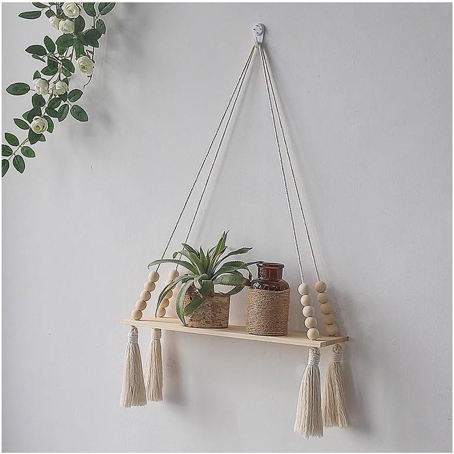 Elevate your interior styling with this handcrafted boho wooden floating shelf, designed to bring warmth and charm to your space. Featuring a 35cm x 12cm wooden plank suspended by sturdy cotton ropes, the shelf is beautifully accented with natural round wooden beads and soft cotton tassels.